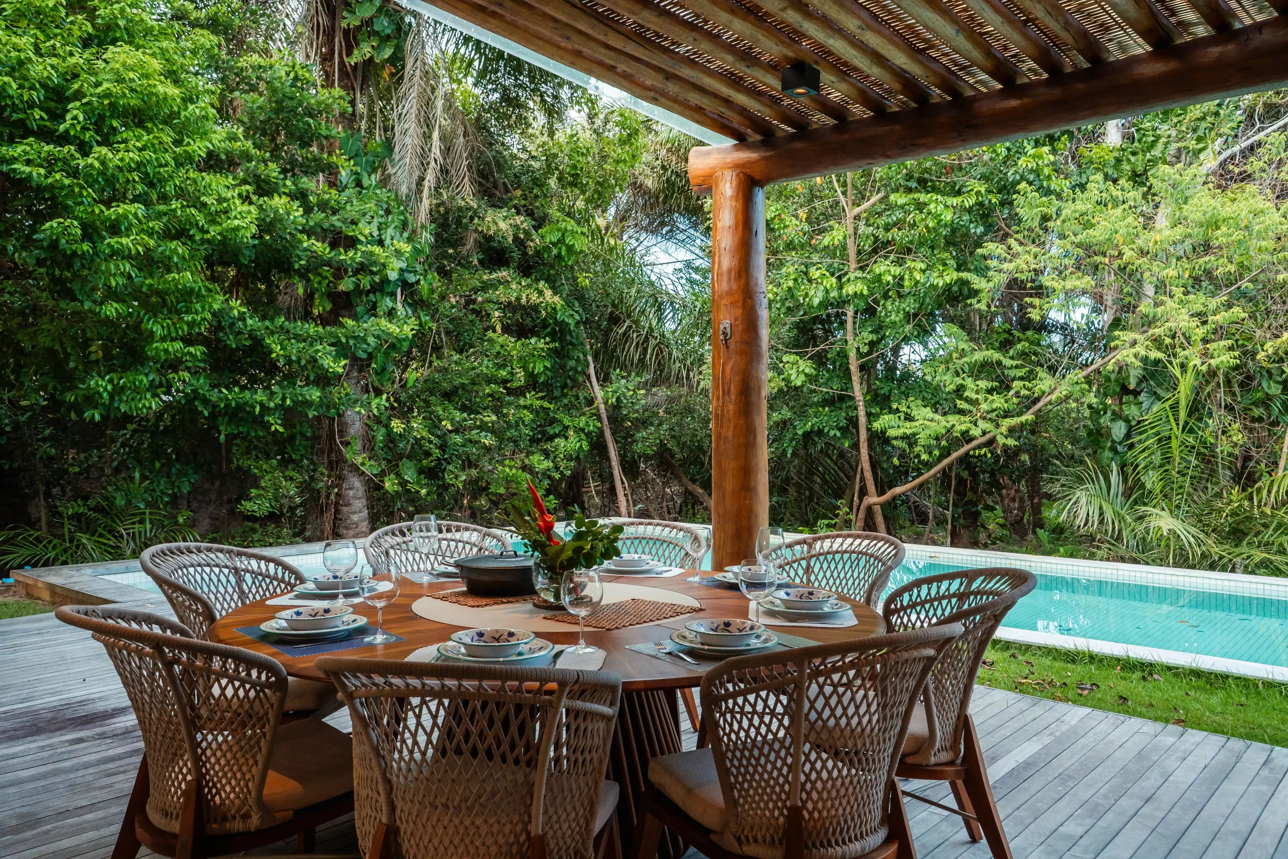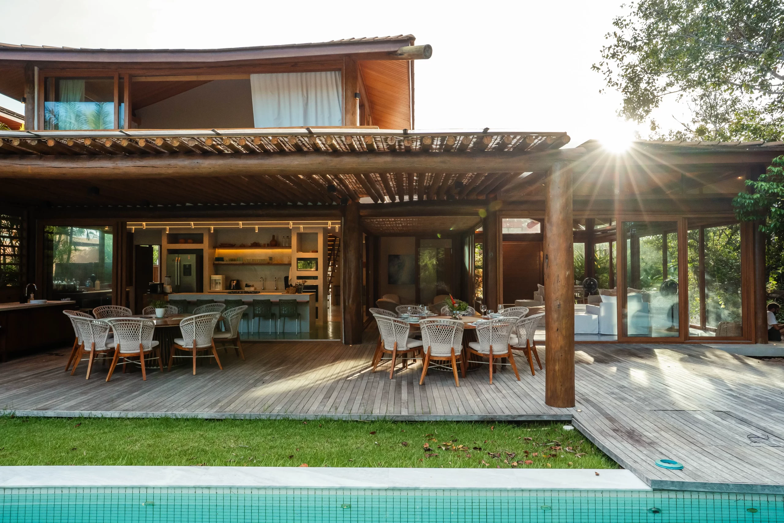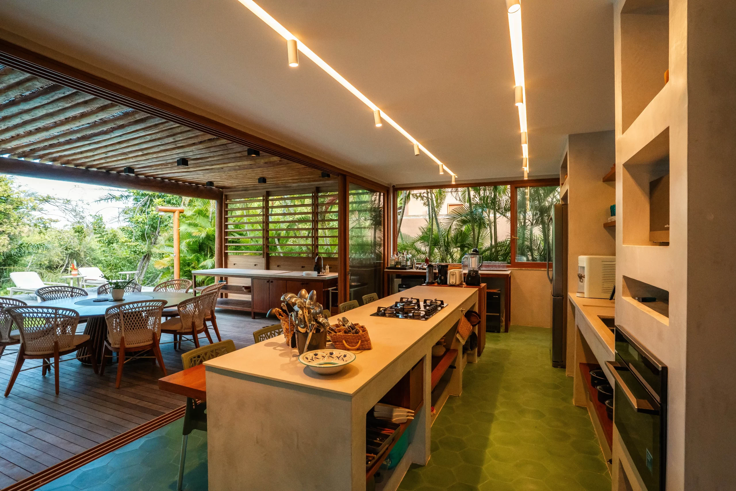 área externa em um único grande espaço, perfeito para reunir família e amigos. A transição para o jardim e a piscina acontece de maneira natural, criando uma experiência