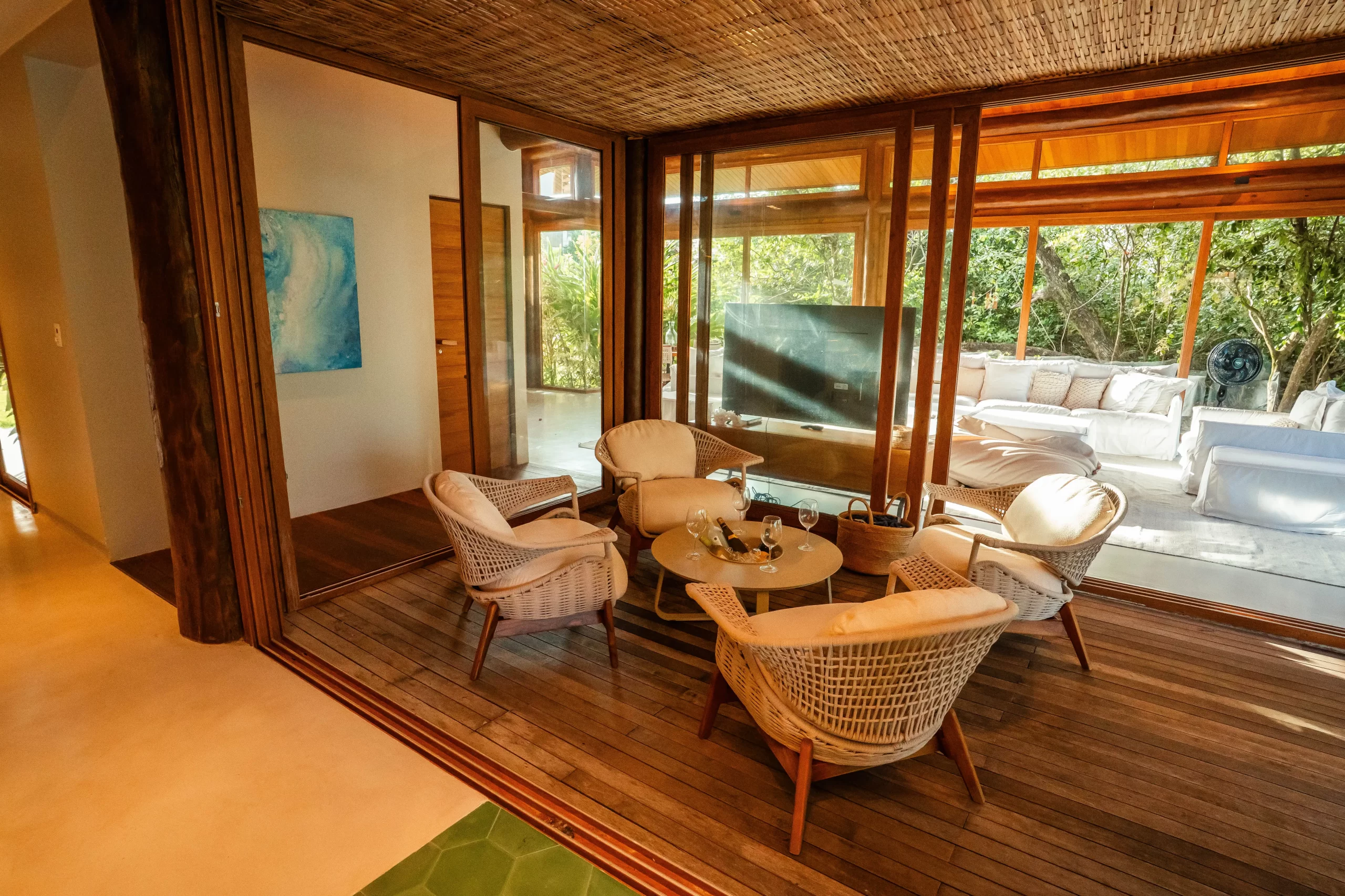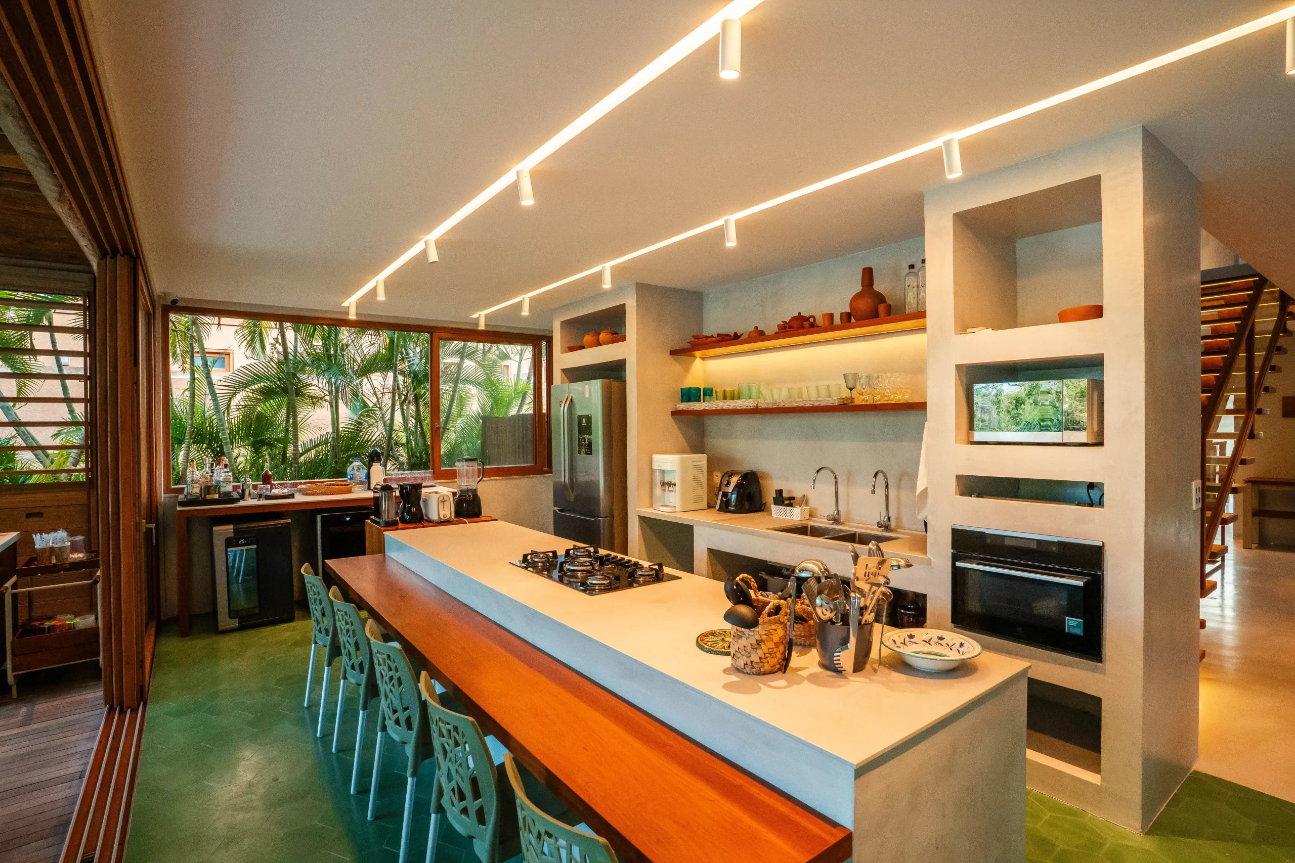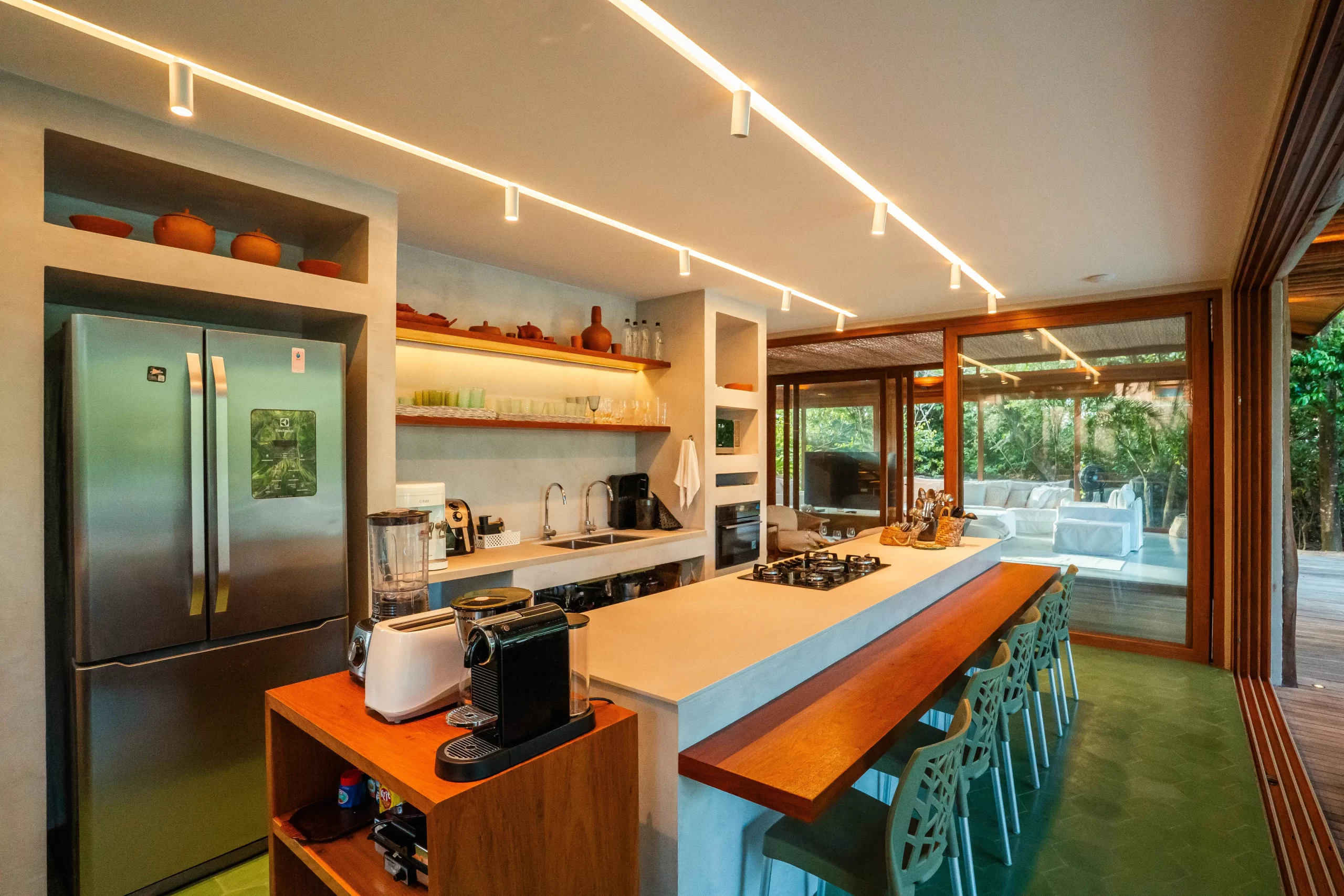área externa em um único grande espaço, perfeito para reunir família e amigos. A transição para o jardim e a piscina acontece de maneira natural, criando uma experiência