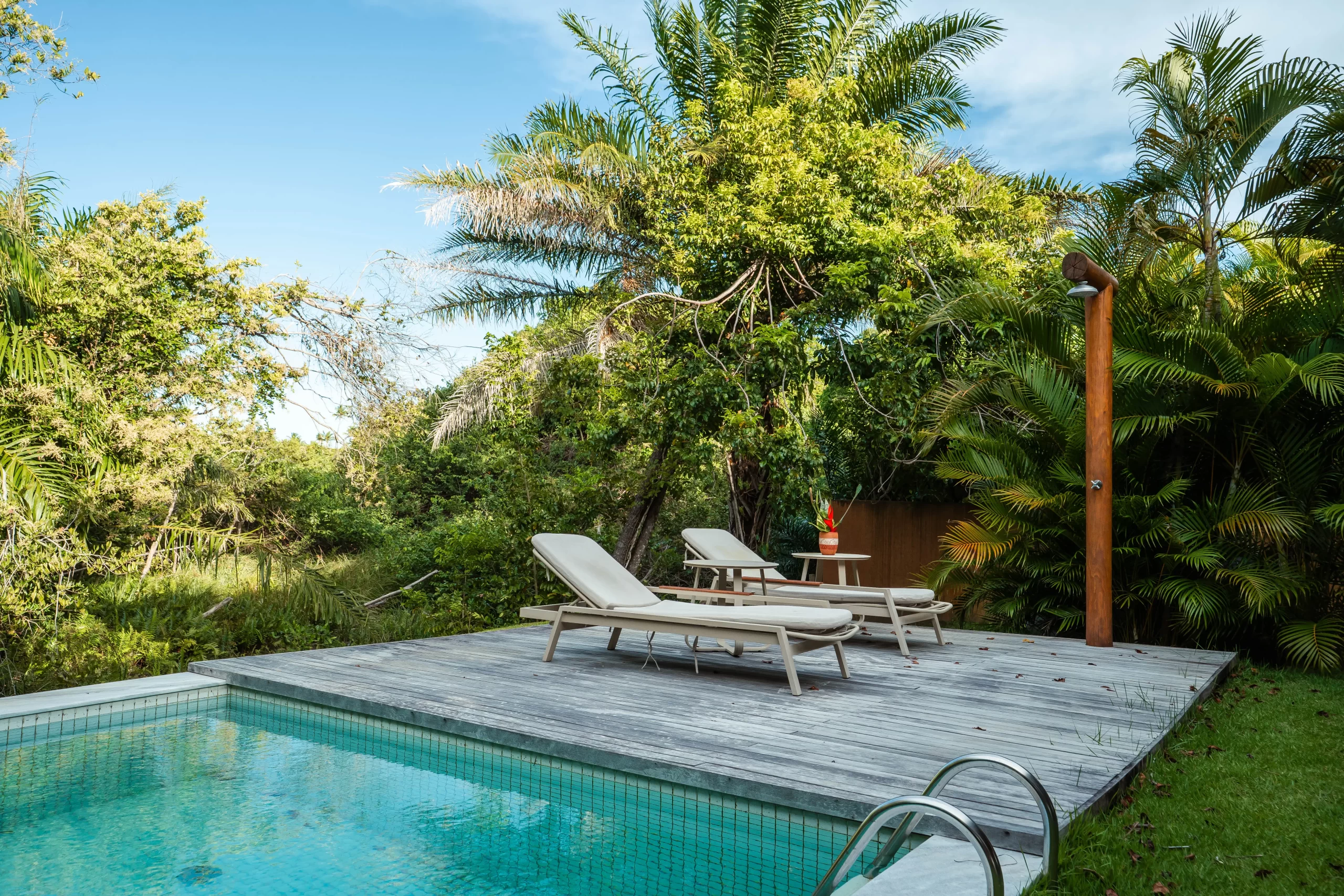 A área externa convida ao descanso e ao prazer. A piscina com hidromassagem se integra à área gourmet equipada com churrasqueira a carvão e adega, formando o cenário ideal para almoços longos, encontros descontraídos e noites especiais sob o céu tropical.